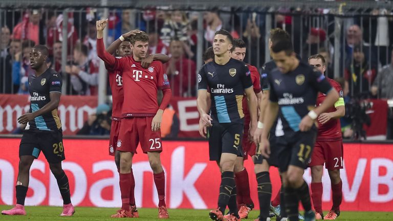 Arjen Robben scored just 38 seconds after coming on as a substitute to make it 4-0, but Arsenal got one back with 20 minutes remaining through Olivier Giroud's superb finish before Muller added a fifth late on. Arsenal now must beat Dinamo Zagreb in their next group game on November 24, hope other results go their way, and then better a 3-2 scoreline at Olympiakos in their final game on December 9.